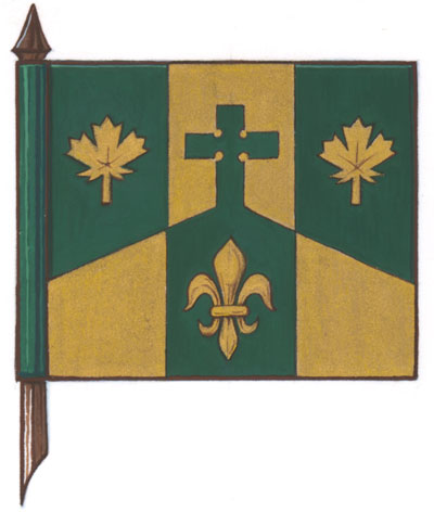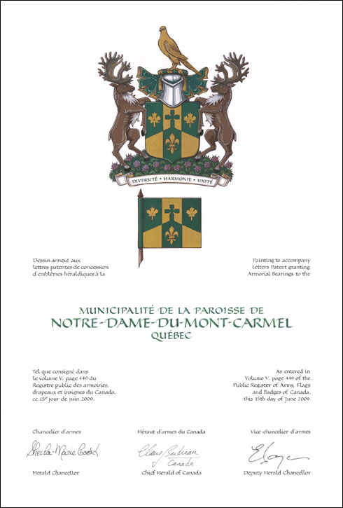 Arms of the Municipalité de la paroisse de Notre-Dame-du-Mont-CarmelBlazonPer chevron Vert and Or the apex terminating in a Celtic cross, overall a pale, in chief two maple leaves and in base a fleur-de-lis, all counterchanged; SymbolismThe three vertical bands represent the geographic location of Notre-Dame-du-Mont-Carmel, a self-governing municipality located between the cities of Shawinigan and Trois-Rivières. Their subdivision into six parts of alternating colours, green and gold, illustrates the importance of agriculture in the municipality’s history. The division line forming a mountain visually represents Notre-Dame-du-Mont-Carmel. The cross, symbolizing the municipality’s Catholic heritage, refers to the cross erected on the mountain. The fleur-de-lis and the maple leaves situate the municipality in Quebec and Canada, respectively. |
