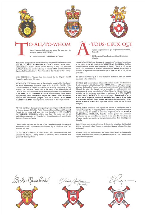 Additional InformationCreator(s)Original concept of Robert Pichette, Dauphin Herald Extraordinary, assisted by the heralds of the Canadian Heraldic Authority. PainterDebra MacGarvie CalligrapherShirley Mangione Recipient TypeCivil Institution