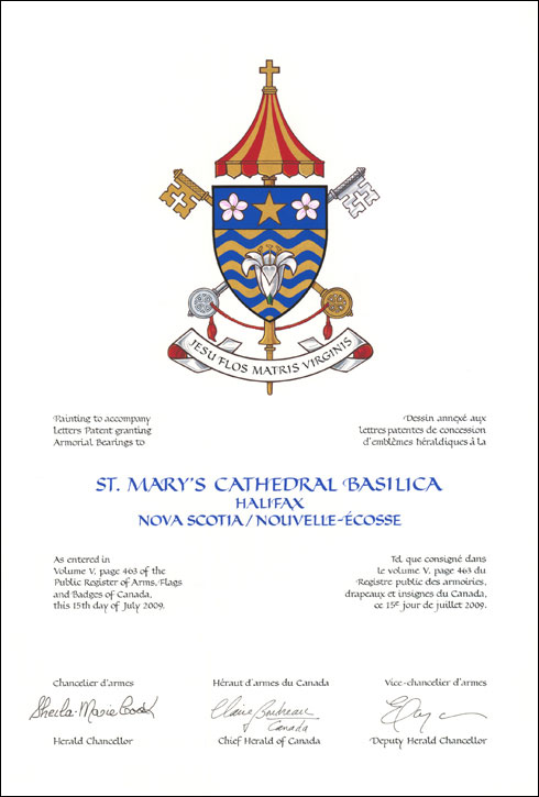 Arms of St. Mary's Cathedral BasilicaBlazonBarry wavy Or and Azure a lily flower proper, on a chief Azure a mullet Or between two mayflowers proper; SymbolismThe wavy bars represent water, referring to Halifax’s importance as an Atlantic sea port. The lily is a symbol of the Blessed Virgin Mary and is thus a reference to the Cathedral’s patron. The gold star, the Stella Maris or “star of the sea”, is another Marian symbol. The mayflowers are the provincial floral emblem of Nova Scotia. |