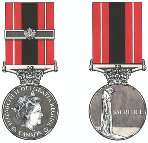Insignia of The Sacrifice MedalBlazonSuspended by the Royal Crown affixed to a clasp from a ribbon Gules charged with a pale Sable between two fillet pales Argent, a silver medal the obverse bearing the effigy of Her Majesty The Queen of Canada contourné, wearing a diadem of maple leaves and snowflakes, and environed by the inscriptions ELIZABETH II DEI GRATIA REGINA and CANADA separated by two maple leaves, the reverse bearing a base and overall to the dexter the statue “Canada” at the Canadian National Vimy Memorial contourné, inscribed to the sinister SACRIFICE; SymbolismThe obverse of the medal depicts the Sovereign, in whose name the medal is bestowed, an idea emphasized by the Royal Crown suspension. The Queen is depicted wearing a diadem composed of maple leave and snowflakes, representing Canada. The reverse of the medal indicates its purpose, the word “Sacrifice” accompanying a statue of an allegorical figure for Canada found at the Canadian National Vimy Memorial in France. This statue, designed by Walter Seymour Allward and unveiled in 1936, symbolizes the nation grieving for her fallen. The statue, looking out over a large field. is of a cloaked and hooded woman holding laurel branches, a symbol of peace, honour and sacrifice. The choice of this symbol connects the medal with the battle of Vimy Ridge, Canada’s most notable military engagement in the First World War and a significant event in Canadian history. In the ribbon, black represents the mourning of the dead and the shock of the wounds, red the blood that has been spilt, and white the hope for a better future. Red and white are also the official colours of Canada. |