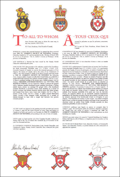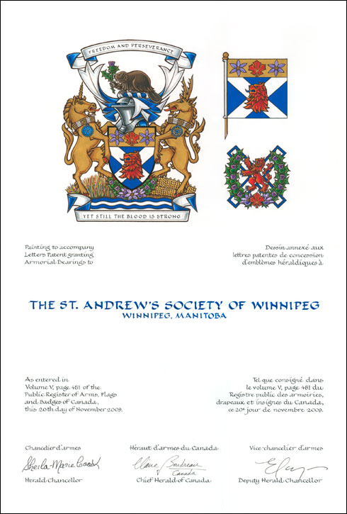 Additional InformationCreator(s)Original concept of Bruce Patterson, Saint-Laurent Herald, and the St. Andrew’s Society of Winnipeg coat of arms design committee, assisted by the heralds of the Canadian Heraldic Authority. PainterEva Pilar-Cass CalligrapherDoris Wionzek Recipient TypeCivil Institution