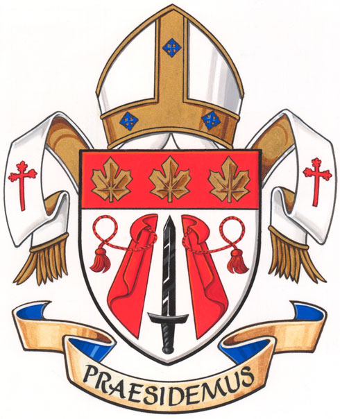 MottoBlazonPRAESIDEMUS; SymbolismPRAESIDEMUS, meaning “We stand on guard”, indicates the pastoral mandate of the Ordinariate and is based on a line repeated several times in the national anthem. |