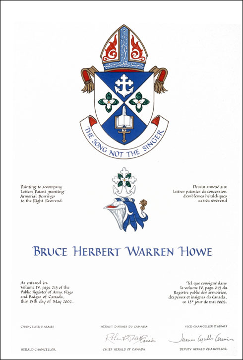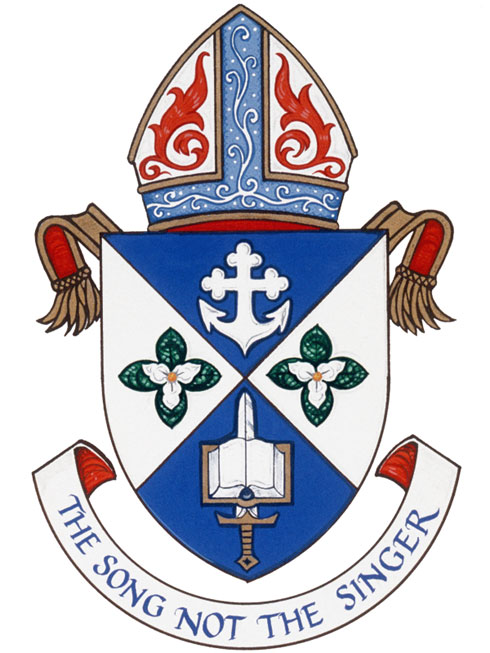 Arms of Bruce Herbert Warren HoweBlazonPer saltire Azure and Argent, in chief a cross bottony conjoined to the flukes of an anchor, in base a sword Argent hilt and pommel Or surmounted by an open book Argent bound Or, in each flank four trillium leaves in cross charged with a trillium flower proper; SymbolismThe division of the shield has many meanings. A saltire is found in the arms of Nova Scotia, where Bishop Howe was born and raised, in the arms of the Diocese of Nova Scotia, where he was ordained and where he served for many years, and in the arms of families named Bruce, thus reflecting his forename. Being the emblem of St. Andrew, the saltire also marks the fact that Bishop Howe was enthroned on St Andrew’s day 2000. The blue and white colours also reflect this fact, as well as his Nova Scotian roots. The saltire can also refer to the first letter in the name of Christ in Greek, and to the crossed swords in the arms of the Diocese of Huron.The anchor refers to Bishop Howe’s father’s naval service, and can also refer to Ss. Simon and Jude, the “fishers of men” in the Gospels, on whose feast day Bishop Howe was consecrated. The Bishop is also a member of the Fishermen’s Union. The endings of the anchor are meant to represent the Trinity, and the trefoil shape is found in the pinnacles of the Cathedral. There is also a trefoil (shamrock or clover shape) in the arms of St. Paul’s Cathedral, which were granted while Bishop Howe was Dean and Rector. The sword and book combination at the bottom of the shield, the traditional symbol of St. Paul (representing his epistle writing and his martyrdom), is a more explicit reference to his twelve years of service as Dean. The trillium flowers refer to Ontario and the Trinity, and the four leaves make a reference to the Bishop’s four daughters. |