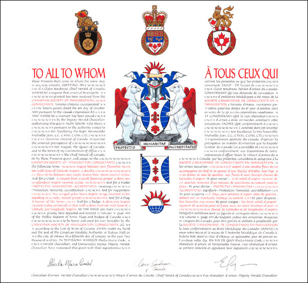 Additional InformationCreator(s)Original concept of Bruce Patterson, Saint-Laurent Herald, assisted by the heralds of the Canadian Heraldic Authority. PainterLinda Nicholson CalligrapherShirley Mangione Recipient TypeCivil Institution
