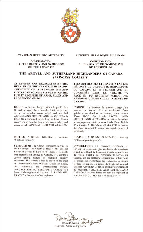 Badge of The Argyll and Sutherland Highlanders of Canada (Princess Louise's)BlazonA torteau charged with a leopard’s face Or and environed by a wreath of thistles proper, overall an annulus Azure edged and inscribed ARGYLL AND SUTHERLAND and CANADA in letters Or surmounted in chief by the Royal Crown proper and in base by two scrolls Azure edged and inscribed ALBAINN and GU-BRATH in letters Or; SymbolismThe Crown represents service to the Sovereign. The wreath of thistles (the national flower of Scotland), here, in the shape of a maple leaf representing service to Canada, is a common device among badges of highland infantry regiments. The leopard’s face is based on the crest of Lieutenant-Colonel William Alexander Logie, the regiment’s first commanding officer. “ARGYLL AND SUTHERLAND CANADA” is a form of the regimental title and “ALBAINN GU-BRATH” is the motto of the regiment. |