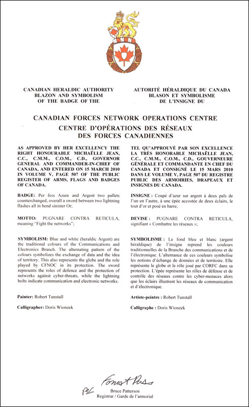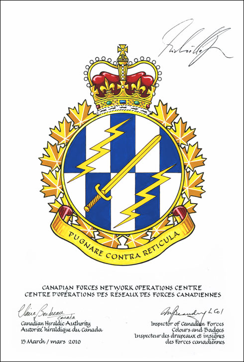 Badge of the Canadian Forces Network Operations CentreBlazonPer fess Azure and Argent two pallets counterchanged, overall a sword between two lightning flashes all in bend sinister Or; SymbolismBlue and white (heraldic Argent) are the traditional colours of the Communications and Electronics Branch. The alternating pattern of the colours symbolizes the exchange of data and the idea of territory. This also represents the globe and the role played by CFNOC in its protection. The sword represents the roles of defence and the protection of networks against cyber-threats, while the lightning bolts indicate communication and electronic networks. |
