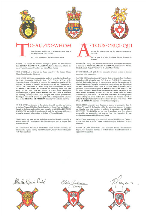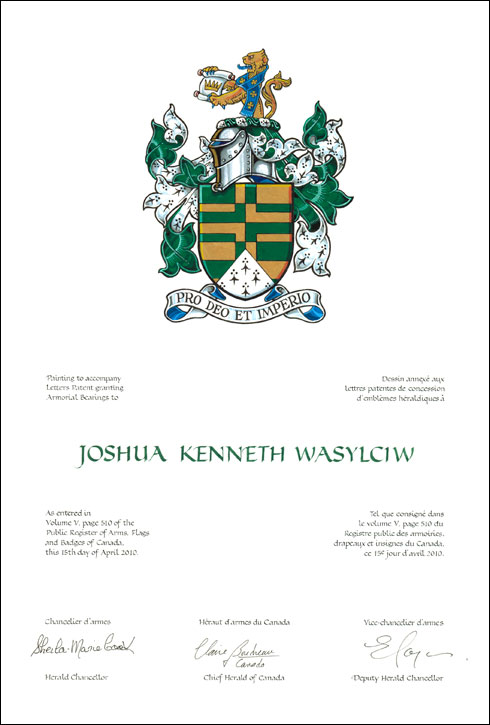 Arms of Joshua Kenneth WasylciwBlazonPer pale barry of six Vert and Or overall a Latin cross throughout counterchanged, a point pointed Ermine; SymbolismThe division of the shield into green and gold rectangles evokes a bird’s eye view of patchwork prairie fields, representing the farming heritage of Mr. Wasylciw’s family and his own upbringing in Alberta’s agricultural Peace River country. Green and gold are the colours of Mr. Wasylciw’s alma mater, the University of Alberta, where they represent the province’s rural character and the pursuit of knowledge respectively, two themes that also underpin Mr. Wasylciw’s personal history. The Latin cross denotes Mr. Wasylciw’s Roman Catholic faith. The triangle in ermine, a fur often associated with royalty, is a reference to Mr. Wasylciw’s strong support for the monarchy; its resemblance to a snow-covered mountain peak recalls his years of volunteer service in the Canadian Ski Patrol. |