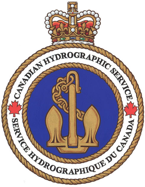 Badge of the Canadian Hydrographic ServiceBlazonOn a hurt a chained anchor Or, all within an annulus Argent edged with rope Or and inscribed with the names CANADIAN HYDROGRAPHIC SERVICE and SERVICE HYDROGRAPHIQUE DU CANADA in letters Sable separated by two maple leaves Gules, the whole surmounted by the Royal Crown proper; SymbolismThe badge was created by CHS employee Gordon B. Croll in 1954. The blue background and anchor are representative of contributions made by the Canadian Hydrographic Service (CHS) to the safety of maritime transportation. The maple leaves evoke the pride in service to Canada and resemble those in the original design, but are now presented in a different position. |