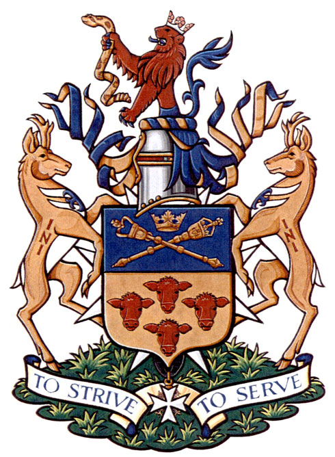 SupportersBlazonOn a mound of Prairie grassland proper two pronghorn antelopes Or and Argent branded on the flank " — Z — " Gules charged on the breast with a cross Moline Azure; |
