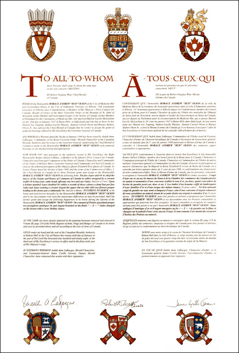 Additional InformationCreator(s)Original concept of Robert D. Watt, Chief Herald of Canada, assisted by the heralds of the Canadian Heraldic Authority. PainterJoan Bouwmeester CalligrapherJoan Bouwmeester Recipient TypeIndividual Special DesignationLieutenant Governor |