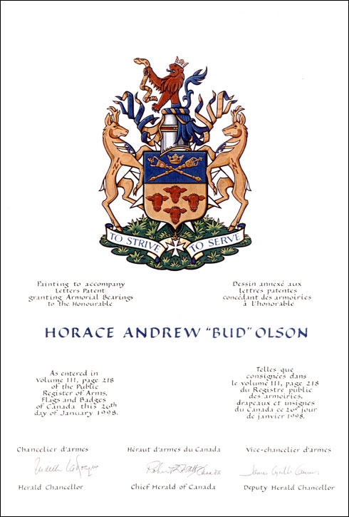 Arms of Horace Andrew (Bud) OlsonBlazonPer fess Azure and Or in chief the maces of the Senate and House of Commons of Canada in saltire ensigned by a coronet érablé Or in base four cattle heads affronty one two and one Gules; |