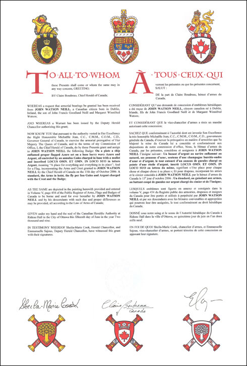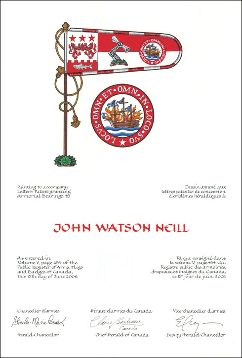 Additional InformationCreator(s)Original concept of John Neill, assisted by the heralds of the Canadian Heraldic Authority. PainterGordon Macpherson CalligrapherDoris Wionzek Recipient TypeIndividual Other InformationOne or more entries related to this Recipient's emblems appear elsewhere in the Register: V, p. 64. |