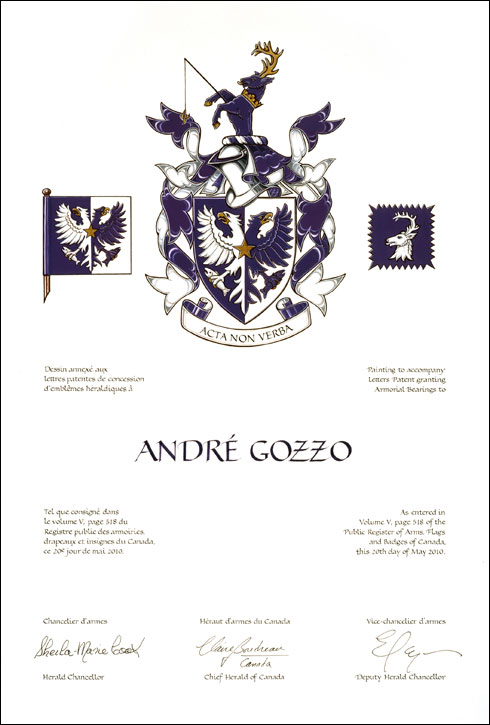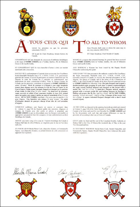 Arms of André GozzoBlazonPer pale Purpure and Argent a double-headed eagle grasping in each claw a salmon counterchanged, the eagle armed, beaked, langued and charged on the breast with a mullet Or; SymbolismFor Mr. Gozzo, white represents wisdom, integrity and perfection, whereas purple evokes authority, dignity and justice, important qualities in a mayor, Mr. Gozzo having been the mayor of Paquetville, New Brunswick, since 2004. The double-headed eagle recalls the two eagles on the coat of arms of the Kingdom of Sicily. Here, the eagles are represented by a single eagle with two heads to convey Mr. Gozzo’s Italian roots and his Canadian citizenship. The gold star symbolizes Acadia, Mr. Gozzo’s adopted land and place of residence. The two salmon refer to his career with Fisheries and Oceans Canada, as well as his role as a consultant to the fishing industry. |