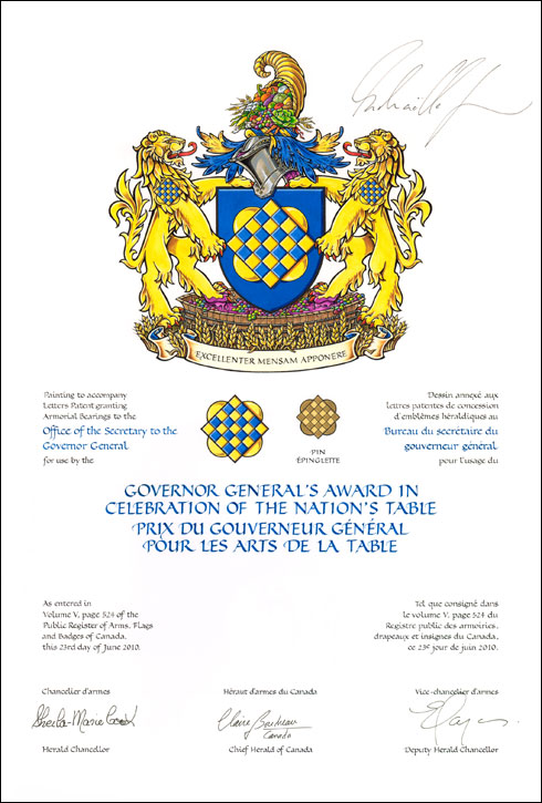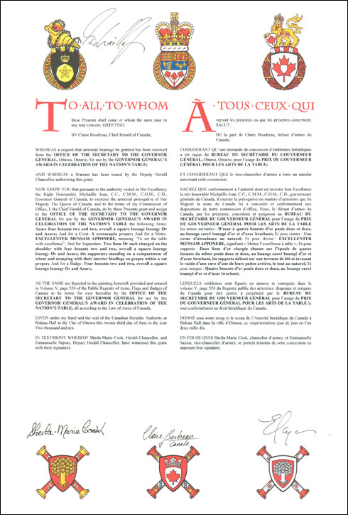Grant of Arms, Supporters and Badge for use by Governor General's Award in Celebration of the Nation's Table