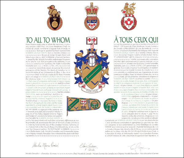 Additional InformationCreator(s)Original concept of Roger Lindsay, Rouge Herald Extraordinary, assisted by the heralds of the Canadian Heraldic Authority. PainterIlona Jurkiewicz CalligrapherShirley Mangione Recipient TypeIndividual |