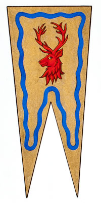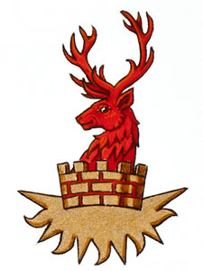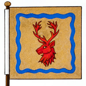 SupportersBlazonTwo stags Gules each attired, charged on the shoulder with a canola flower Or seeded of a goutte de poix and standing on a grassy mount Vert; SymbolismThe stags repeat the symbolism of the name, the canola flowers represent local agriculture, and the drops refer to the oil and gas industries. The base is composed of prairie grass. |