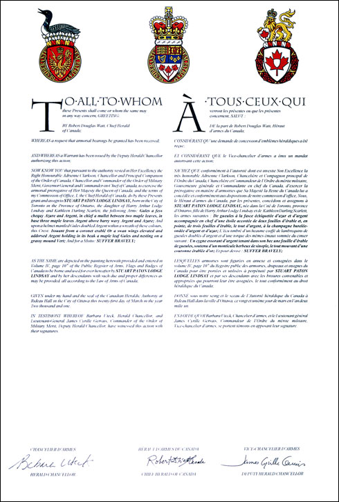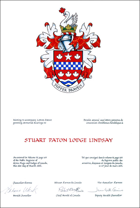 Arms of Stuart Paton Lodge LindsayBlazonGules a fess chequy Azure and Argent, in chief a mullet between two maple leaves, in base three maple leaves Argent above barry wavy Argent and Azure; SymbolismThe design for Ms. Lindsay is based on the general pattern of Scottish Lindsay arms, a red shield with a blue and white chequy fess. The wavy base recognizes that the family crossed the waters to reside in Canada. The white star alludes to the descent through a particular line of Lindsays, and the maple leaves indicate the five generations of the family in Canada. |