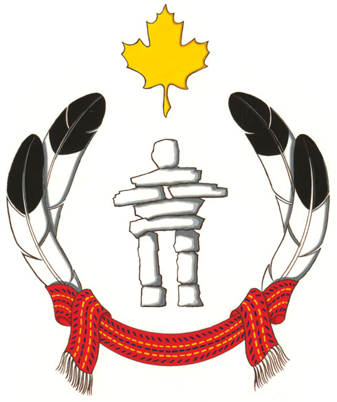 Badge of the Royal Canadian Mounted Police, Aboriginal Policing ServicesBlazonAn inuksuk Argent ensigned by a maple leaf Or and flanked by four eagle feathers issuant from a sash draped fesswise proper; SymbolismThe maple leaf refers to the national mandate of the Aboriginal Policing Services, and the other symbols to the major Indigenous groups in Canada: eagle feathers for the First Nations, an inuksuk for the Inuit, and the sash for the Métis. |