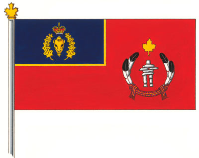 Flag of the Royal Canadian Mounted Police, Aboriginal Policing ServicesBlazonThe national ensign of the Royal Canadian Mounted Police (An ensign Gules its canton Azure fimbriated Or charged with a bison’s head affronty within a wreath of maple leaves Or and ensigned by the Royal Crown proper) charged in the fly with the Badge of the Aboriginal Policing Services; SymbolismThe flag follows the pattern of Royal Canadian Mounted Police division flags. |