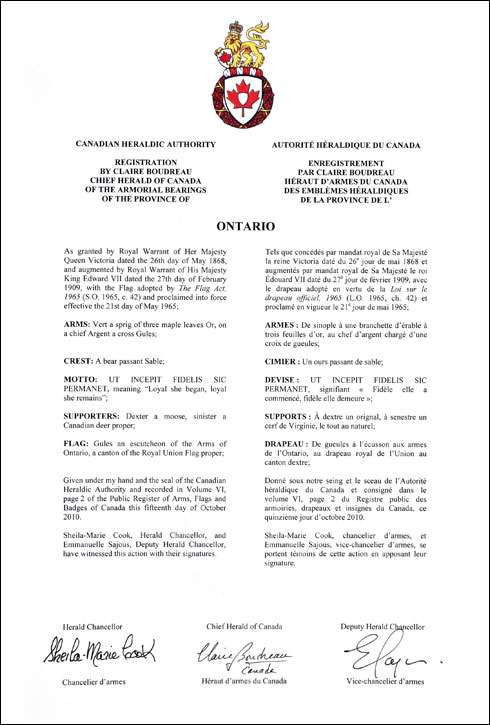 Additional InformationCreator(s)Original concept of the heralds of the College of Arms, London (Arms), Edward Marion Chadwick (Crest, Motto and Supporters) and the Government of Ontario (Flag). PainterDennis Field CalligrapherNot applicable Recipient TypeCivil Institution