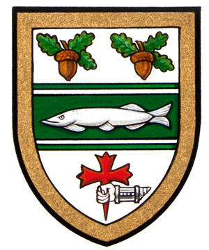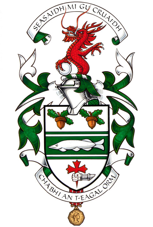 Arms of John Francis Archibald PykeBlazonArgent on a fess cotised Vert between in chief two acorns slipped and leaved and in base a cubit arm in armour proper fesswise holding a cross patonce fitché Gules, a northern pike Argent; SymbolismThe green of the fess is taken from the tartan of Macdonald of Sleat, denoting Mr. Pyke’s membership in the Clan Donald. It also resembles the belt worn by practitioners of Asian martial arts, of which Mr. Pyke is an accomplished instructor. The pike is a common charge on Pyke arms in Great Britain and it is a pun on Mr. Pyke’s surname. The northern pike is native to the Thames River that flows through the city of London, Ontario, the hometown of Mr. Pyke. A fish on a fess also alludes to the former arms of the province of Nova Scotia (1868-1929), where Mr. Pyke was born, and to his many fishing ancestors. The acorns refer to the badge of Mr. Pyke’s reserve unit, the 22 (London) Service Battalion, which features two oak trees, and to the Oakridge Acres neighbourhood in London where he resides. Their number represents his two daughters. A hand clutching a red cross is a common charge on Macdonald arms. The cross patonce recalls a maple leaf, representing Mr. Pyke’s particular service to his clan in Canada. |