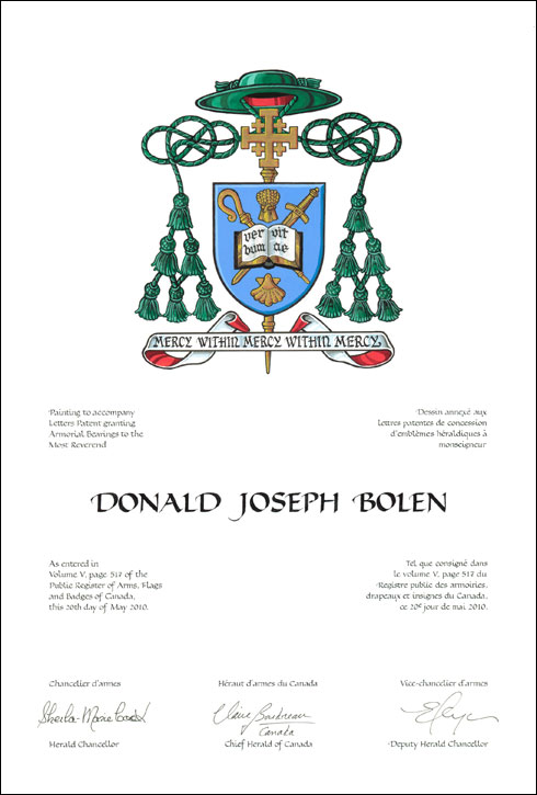Arms of Donald Joseph BolenBlazonAzure a crozier and a sword hilt in chief in saltire Or surmounted by an open book proper edged Or inscribed VERBUM VITAE, in letters Sable, all between in chief a garb and in base an escallop Or; SymbolismThe blue colour refers to the open skies of the Canadian Prairies, the birthplace of Bishop Bolen. The crozier is a symbol of episcopal authority as the shepherd of a flock. The sword is a symbol of St. Paul, to whom the Diocese of Saskatoon is dedicated. The open book bearing the words VERBUM VITAE (meaning “the Word of Life”), a Pauline description of the scriptures, refers to the Bible and to the book in the assumed arms of the city of Saskatoon. The wheat is taken from the arms of the province of Saskatchewan and refers to the wheat farming occupation of Bishop Bolen’s family. The shell is a symbol of pilgrimage, and is also found in the arms of Pope Benedict XVI, who named Msgr. Bolen as Bishop of Saskatoon. |