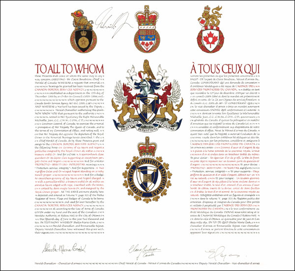 CrestBlazonA sparrowhawk close guardant Or its dexter claw supporting an escutcheon per pale Gules and Argent; SymbolismThe sparrowhawk is a brave warrior with keen eyesight; it represents the Agency’s members as being professional and alert observers. The shield in Canada’s colours symbolizes that this is an Agency of Canada. It is similar in shape to the badges of office and recall that many of the Agency’s members are sworn peace officers. |