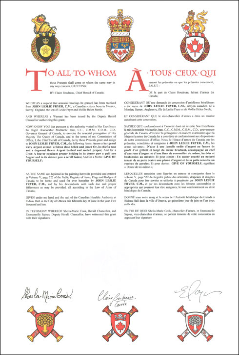 The contents of this Register are intended for research purposes only. The heraldic emblems found in the Register may not be reproduced in any form or in any media without the written consent of the Canadian Heraldic Authority and/or the recipient.