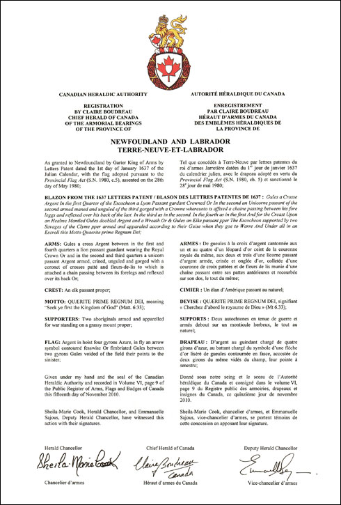 Other InformationThe arms were recorded in the records of the College of Arms, London, 1 January 1637 (Julian Calendar). The flag was adopted pursuant to the Provincial Flag Act (S.N. 1980, c. 5), assented on 28 May 1980. |