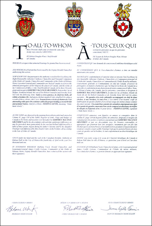 Additional InformationCreator(s)Original concept of Graham Anderson, assisted by the Heralds of the Canadian Heraldic Authority PainterDavid Farrar CalligrapherNancy Ellis Recipient TypeIndividual |