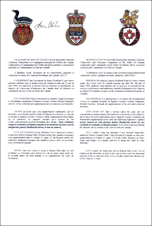 SupportersBlazonUpon a grassy mound set with gloriosa daisies (Rudbeckia hirta) Or two cardinals (Cardinalis cardinalis) proper; SymbolismCardinals are among the most colourful birds using the feeder in the Vachon backyard. Along the same lines as the motto, this bird surveys his surroundings very carefully before coming to get food. The yellow daisies on the grassy mound recall the pretty bouquets of these flowers on the farm in Northern Ontario's Sturgeon Falls, Mr. Vachon's birthplace. |