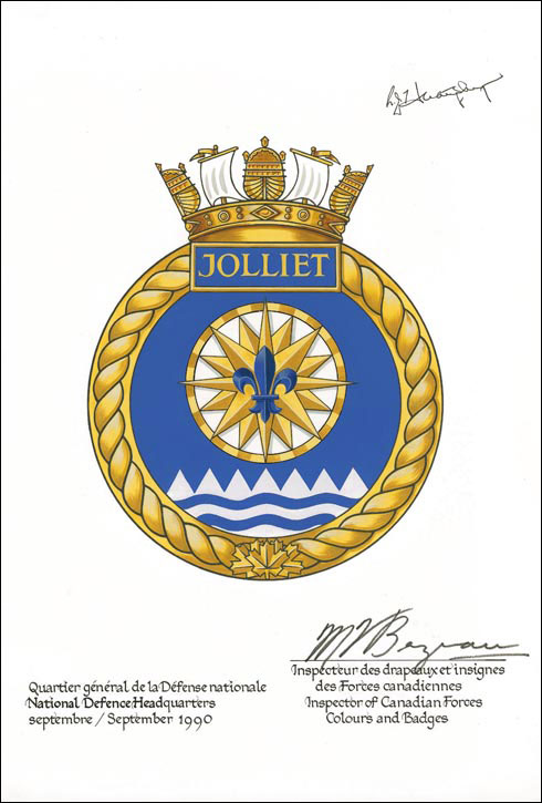 Badge of HMCS JollietBlazonAzure above a base indented of seven Argent charged with two barrulets wavy Azure a plate bordered Or surmounted by a compass rose Or charged with a fleur-de-lys Azure; SymbolismThe compass rose recalls Louis Jolliet, the explorer and cartographer from whom the ship takes her name. The blue colour represents the St. Lawrence River. The seven peaks and the fleur-de-lis symbolize Sept-Îles, Quebec, the home of the ship. |