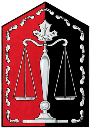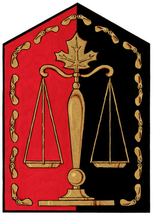 Badge of the Senior Citizenship JudgeBlazonSenior Citizenship Judge: On a billet pointed in chief per pale Gules and Sable a balance its finial a maple leaf all environed by maple seeds Or; SymbolismThe shape of the badges suggests a doorway, welcoming new citizens to the country. The use of black and red represents the judicial vesture of Citizenship Judges. The balance, or scales of justice, represents the judges’ role in assessing and judging citizenship applications. The maple seeds allude to the potential of new citizens to grow and flourish as Canadians. |