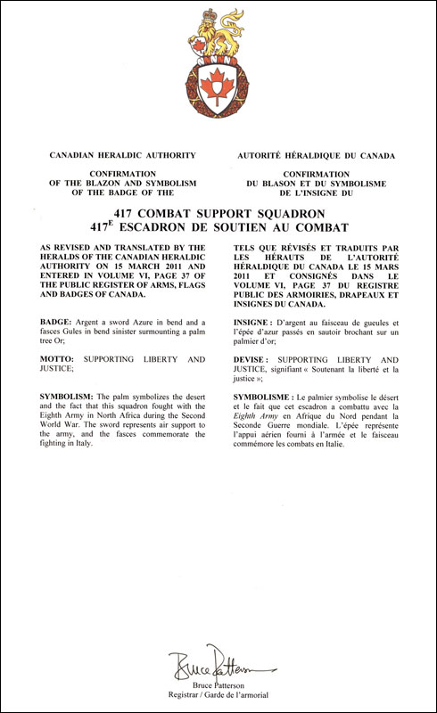 Badge of the 417 Combat Support SquadronBlazonArgent a sword Azure in bend and a fasces Gules in bend sinister surmounting a palm tree Or; SymbolismThe palm symbolizes the desert and the fact that this squadron fought with the Eighth Army in North Africa during the Second World War. The sword represents air support to the army, and the fasces commemorate the fighting in Italy. |
