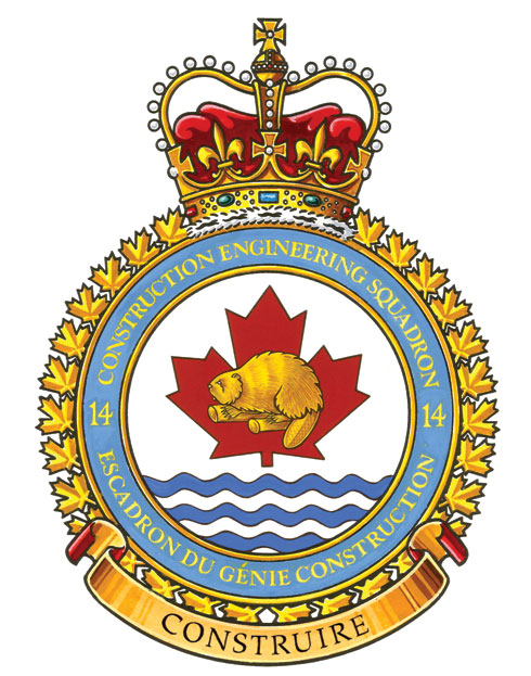 Badge of 14 Construction Engineering SquadronBlazonArgent on a maple leaf Gules a beaver couchant on logs Or, in base three barrulets wavy; SymbolismThe badge features the national colours, red and white. The unit’s service to the nation is underlined by the red maple leaf, while the beaver is the most recognizable emblem of Canadian military engineering. The three wavy blue lines symbolize maritime flights. |