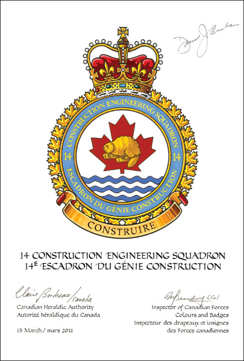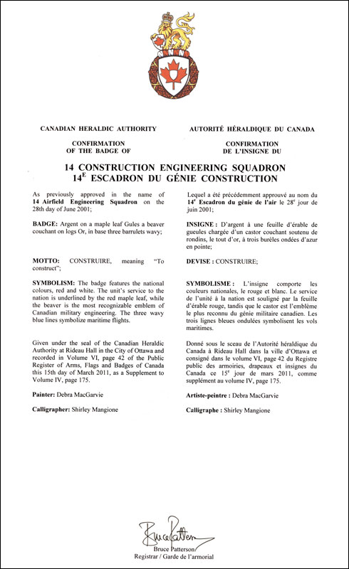 Additional InformationCreator(s)Not available PainterDebra MacGarvie CalligrapherShirley Mangione Recipient TypeMilitary Institution Other InformationThe recipient's emblems were originally recorded in the name of 14 Airfield Engineering Squadron in the Public Register of Arms, Flags and Badges of Canada, Volume IV, page 175, 28 June 2001. |