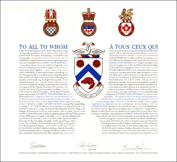 Arms of Robert John BridgesBlazonArgent a chevron Azure between in chief two roses and in base a beaver couchant Gules; SymbolismThe roses represent Mr. Bridges’ English heritage while their number represents his two children. The red, white and blue of the shield recall the Royal Union Flag. The beaver symbolizes Canada, Mr. Bridges’ adopted home, and his leadership in the construction and restoration business. The chevron represents the divide between Mr. Bridges’ old and new countries; it also resembles a mason’s square – a reference to his stone restoration business – and a bridge, a pun on his surname. |