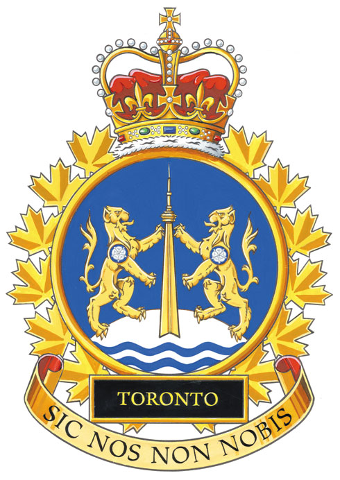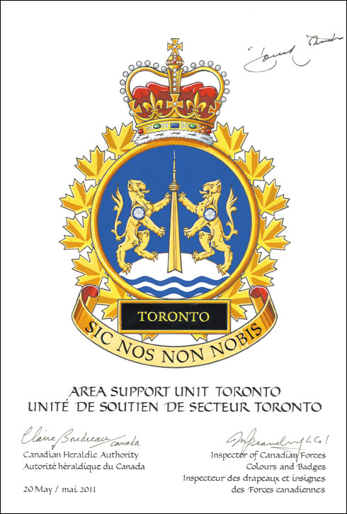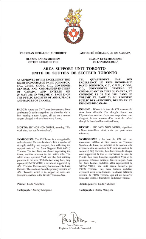 Badge of Area Support Unit TorontoBlazonAzure the CN Tower between two lions combatant Or each charged on the shoulder with a hurt bearing a rose Argent, all set on a mount Argent charged with two bars wavy Azure; SymbolismThe CN Tower is a recognizable and celebrated Toronto landmark. It is a symbol of strength, stability and support, thus reflecting the support role of the Area Support Unit (ASU) Toronto. The two lions are shown supporting the tower, another allusion to the unit’s role. The white roses represent York and the first military presence in the area. With the two wavy bars, they represent HMCS YORK, a naval unit supported by ASU Toronto. The two wavy bars also evoke Lake Ontario. The motto defines the primary mission of ASU Toronto, which is to support all units and formations within in the Greater Toronto Area. |