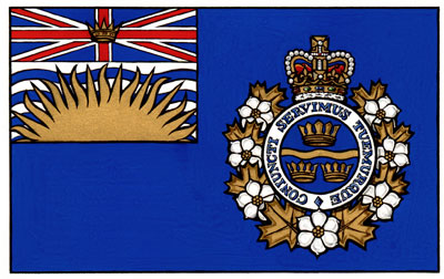 Flag of the Association of Municipal Chiefs of Police of British ColumbiaBlazonAzure the Badge of the Association, a canton of the Arms of the province of British Columbia; SymbolismThe use of the provincial flag indicates that the officials of the provincial government work with the Association and that the Association’s members serve throughout the province. |