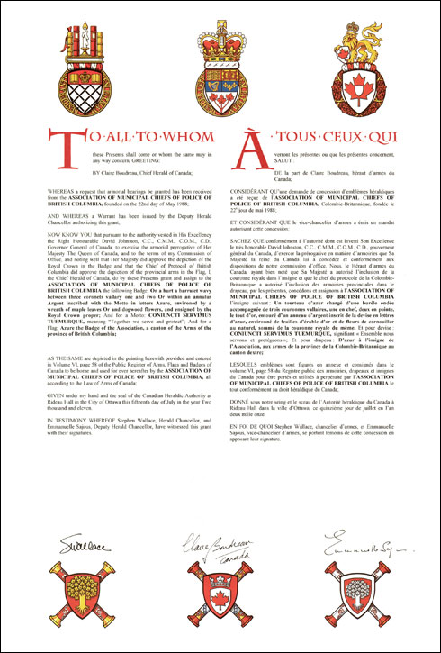 The contents of this Register are intended for research purposes only. The heraldic emblems found in the Register may not be reproduced in any form or in any media without the written consent of the Canadian Heraldic Authority and/or the recipient.