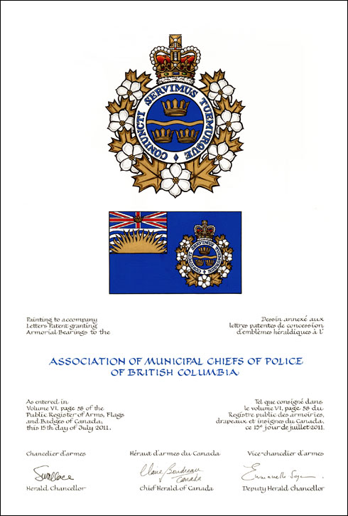 Badge of the Association of Municipal Chiefs of Police of British ColumbiaBlazonOn a hurt a barrulet wavy between three coronets vallary one and two Or within an annulus Argent inscribed with the Motto in letters Azure, environed by a wreath of maple leaves Or and dogwood flowers, and ensigned by the Royal Crown proper; SymbolismBlue is a colour traditionally associated with policing. Blue and yellow are colours which figure prominently in the coat of arms of British Columbia. The wavy stripe in the centre represents the waters of the rivers and the ocean which are a major geographic feature for all the communities served by the forces whose chiefs make up the Association. As well, it divides the field in two parts representing the Association’s members from mainland British Columbia and Vancouver Island. The wreath of maple leaves and dogwood flowers symbolizes the Canadian and British Columbian character of the Association. The Royal Crown represents the fact that the member forces represented by the Association play a key role in guarding the Crown’s peace. |