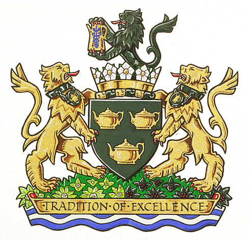 SupportersBlazonOn a grassy mound rising above barry wavy Argent and Azure set dexter with tea plants and sinister with coffee plants flowered Proper two lions Or gorged with collars pendant therefrom by two chains Vert a pomeis charged dexter with a teapot sinister with a coffee pot Or; |