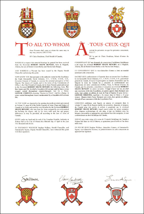 Additional InformationCreator(s)Original concept of Robert Shane Bengry, assisted by the heralds of the Canadian Heraldic Authority. PainterPalina Klimava CalligrapherDoris Wionzek Recipient TypeIndividual |