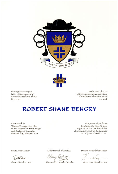 Arms of Robert Shane BengryBlazonPer fess Azure and Or, in chief a Loyalist civil coronet and in base a cross couped voided throughout counterchanged; SymbolismThe gold and blue recall the Canadian Prairie where Father Bengry was born and raised and where his ancestors toiled as pioneers. The colours also represent the chief sacraments of which every Christian priest is steward: the wheat of the Holy Eucharist and the waters of Holy Baptism; the gold also represents Christ Himself while blue is the traditional colour of the Blessed Virgin Mary. The coronet recognizes his Loyalist ancestry and symbolizes Father Bengry’s enthusiastic support for the Canadian monarchy. The cross alludes to his primary identity in the Church as a priest and Benedictine Canon. |