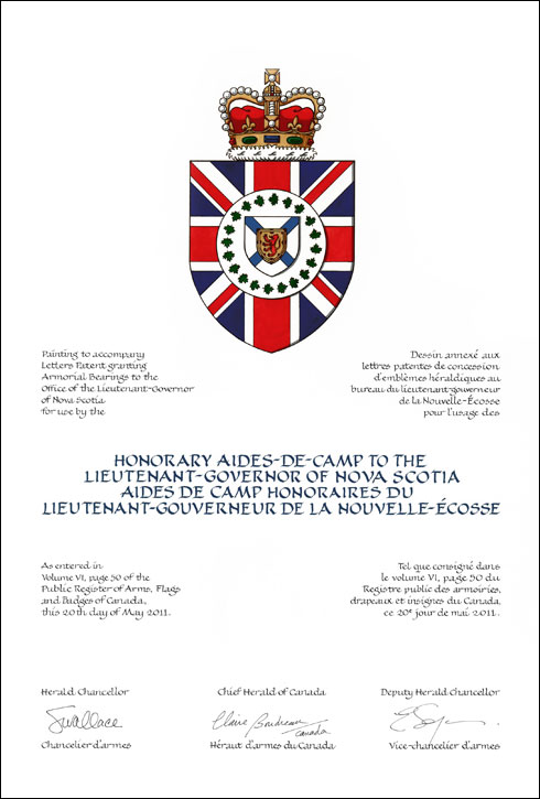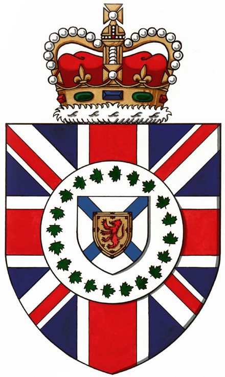 Badge for the Office of the Lieutenant-Governor of Nova ScotiaBlazonThe Royal Union Badge proper charged with a plate bearing the shield of the Arms of the province of Nova Scotia proper within maple leaves in orle Vert, the whole ensigned by the Royal Crown proper; SymbolismThe design, created in the late 1940s, is a shield form of the flag of the Lieutenant-Governor of Nova Scotia, which dates from 1929. The Royal Crown indicates the role of the Honorary Aides-de-Camp in serving the Crown in Right of Nova Scotia. |