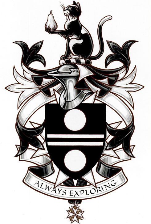 CrestBlazonA cat sejant Sable and Argent holding a pear Argent; SymbolismThe cat is a symbol of curiosity, and thus refers to the motto, as does the pear, occasionally used in place of the apple to symbolize the fruit of the Tree of Knowledge. The pear is also a pun on Ms. Perry’s surname. |