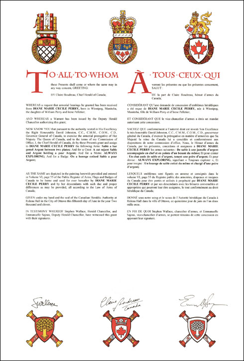 The contents of this Register are intended for research purposes only. The heraldic emblems found in the Register may not be reproduced in any form or in any media without the written consent of the Canadian Heraldic Authority and/or the recipient.