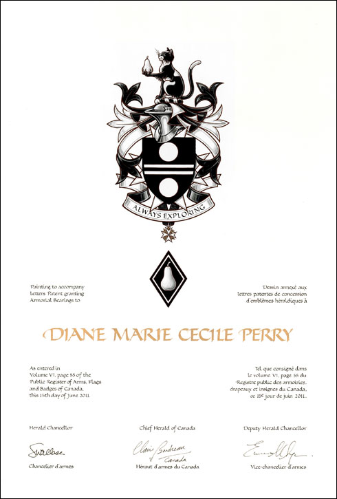 Arms of Diane Marie Cecile PerryBlazonSable a bar gemel Argent between two plates; SymbolismThe two white stripes border a black stripe, a reference to Ms. Perry’s fourth-degree black belt in Taekwondo. The two white stripes also recall the Red and Assiniboine Rivers, identifying Ms. Perry as a lifelong Winnipegger. The white discs on black above and below the white bars suggest two cameras, a reference to Ms. Perry’s passion for photography; they also represent the lens and light source of a microscope, with the stripes between as the slide and stage, a subtle allusion to Ms. Perry’s profession as a medical laboratory technologist. The discs and stripes also form the Morse Code letter “P” (● ▬ ▬ ●), Ms. Perry’s initial and a reference to her involvement in amateur radio. Finally, the two discs represent full moons, an allusion to the Roman goddess of the moon, Diane or Diana, and thus to Ms. Perry’s given name. |