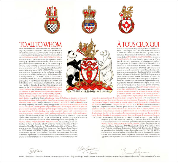 Other InformationThe recipient's emblems were subsequently recorded in the name of Wong's Benevolent Association in the Public Register of Arms, Flags and Badges of Canada, Volume VI, page 151, 20 July 2012. |