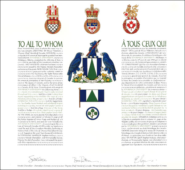 Additional InformationCreator(s)Original concept of Bruce Patterson, Deputy Chief Herald of Canada, assisted by the heralds of the Canadian Heraldic Authority. PainterDavid Farrar CalligrapherShirley Mangione Recipient TypeCivil Institution